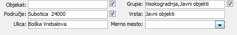 kriterijumima kao što su npr.: "Objekat:", "Područje:", "Ulica:", "Grupa:", "Vrsta:", "Merno mesto:".
