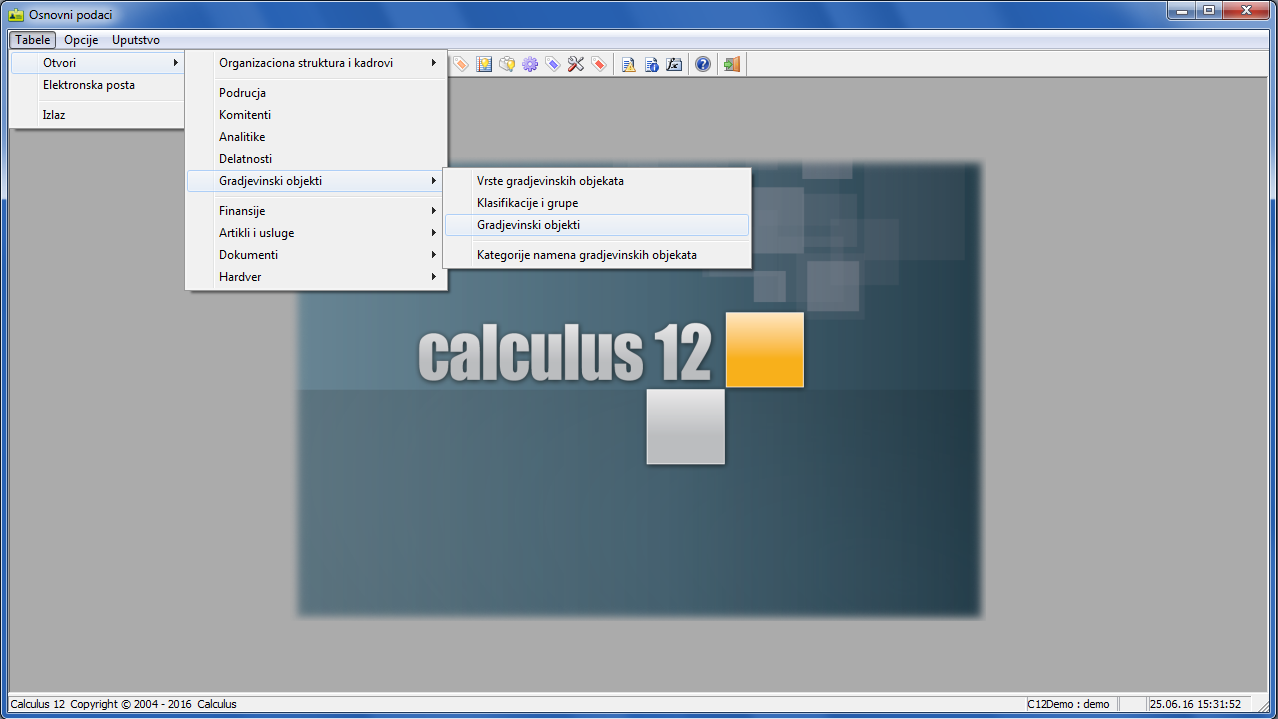 U glavnom meniju programa "Osnovni podaci" odaberite stavku "Tabele - Otvori - Građevinski objekti - Građevinski objekti"