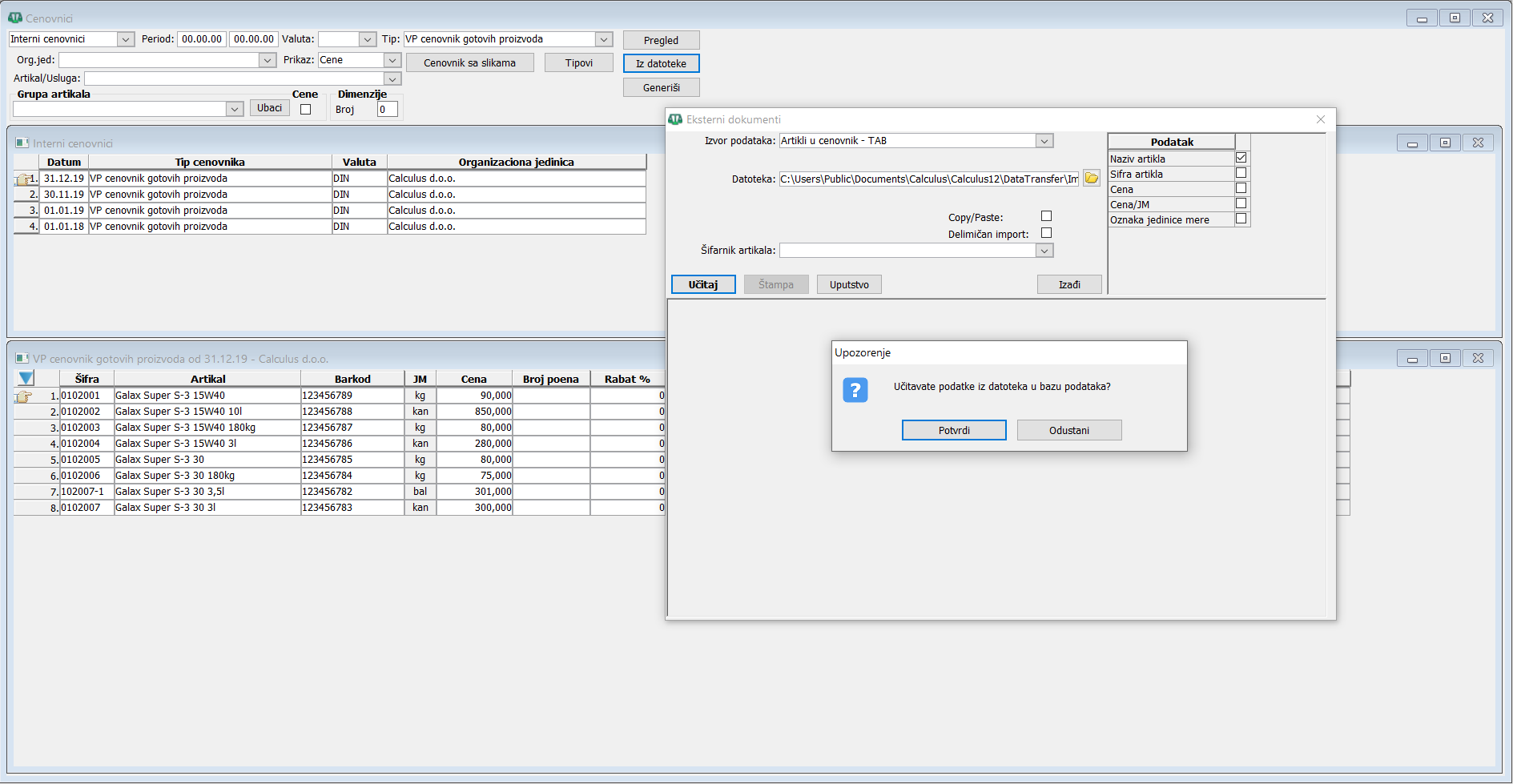 Klikom na dugme "Učitaj" program će najpre izbaciti upozorenje sa pitanjem: Učitavate podatke iz datoteka u bazu podataka? a posle vaše potvrde će izvršiti učitavanje. Klikom na dugme "Izađi" odustajete od uvoza cenovnika. Kliknite na dugme "Pregled" kako biste osvežili pregled cenovnika.