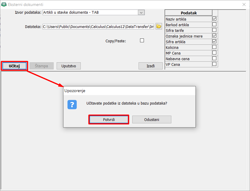 Klikom na dugme "Učitaj" program će najpre izbaciti upozorenje sa pitanjem: Učitavate podatke iz datoteka u bazu podataka? a posle vaše potvrde će izvršiti učitavanje. Klikom na dugme "Izađi" za određene tipove dokumenata otvara se novi prozor za obračun u kome možete pustiti obračun stavki ili odustati.