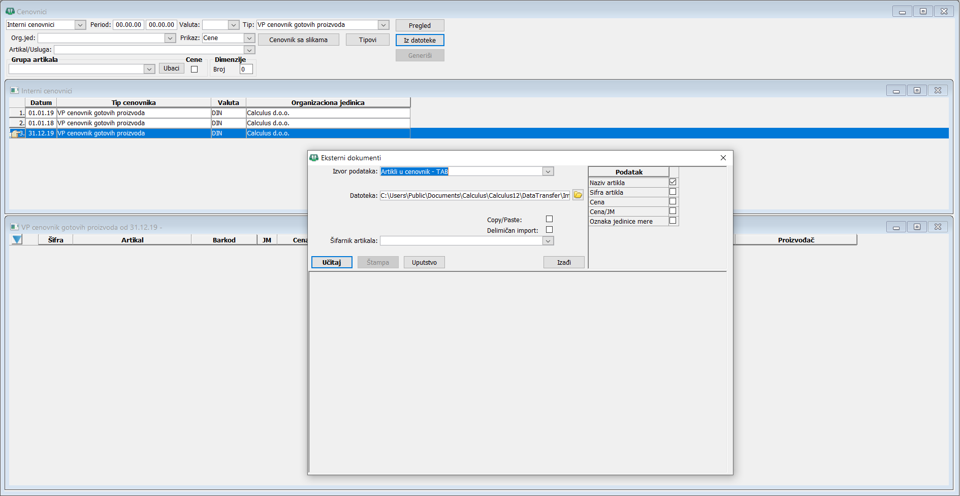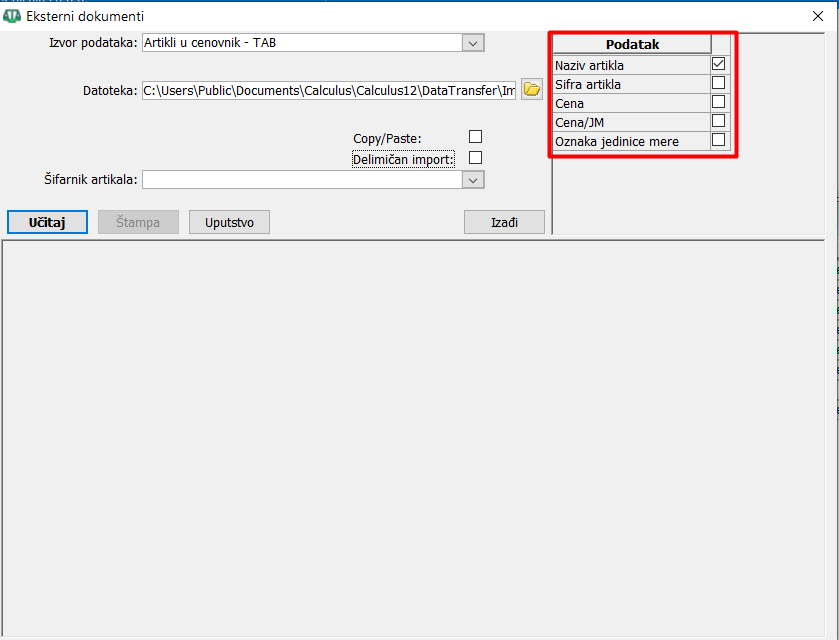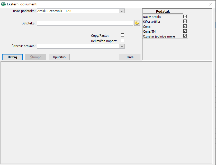 Dugmetom "Učitaj" učitajte podatke, npr. cenovnik, u program. U slučaju uvoza u cenovnik cene će biti učitane samo u prethodno selektovani cenovnik pre otvaranja prozora, ( vidi sliku ) .