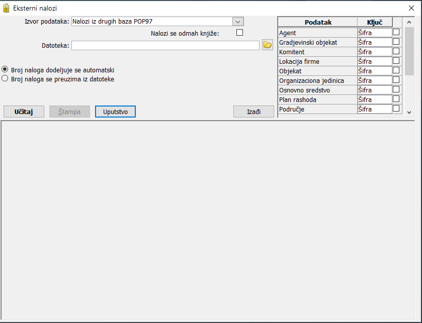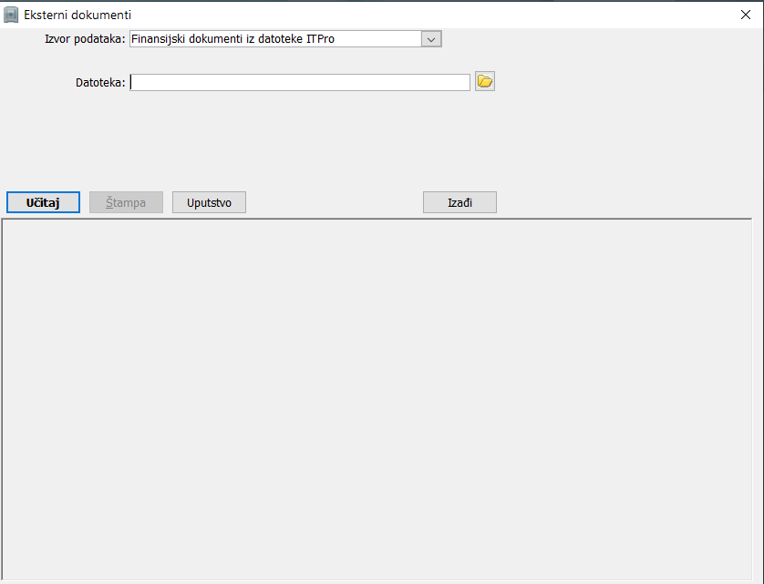 Selektujte dokument u koji želite da uvezete podatke i klikom na dugme "Iz datoteke da otvorite novi iskačući dijalog prozor "Eksterni dokumenti". Prozor sadrži tri sekcije - sekciju za izbor formata datoteke i izbor putanje na kojoj se nalazi datoteka za uvoz, sekciju sa kolonom "Podatak" gde su prikazana polja koje sadrži datoteka iz koje se uvoze podaci i sekciju za prikaz poruka i uveženih podataka, ( vidi sliku ) .