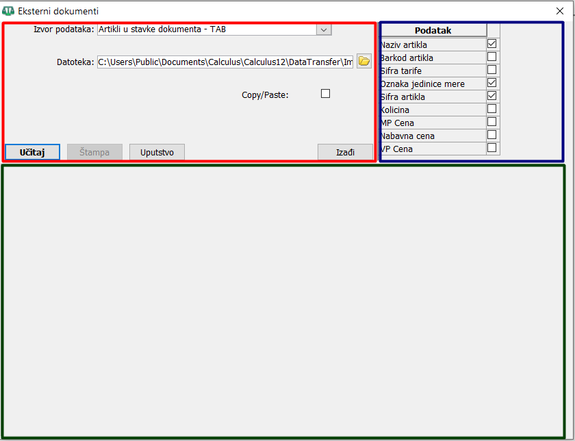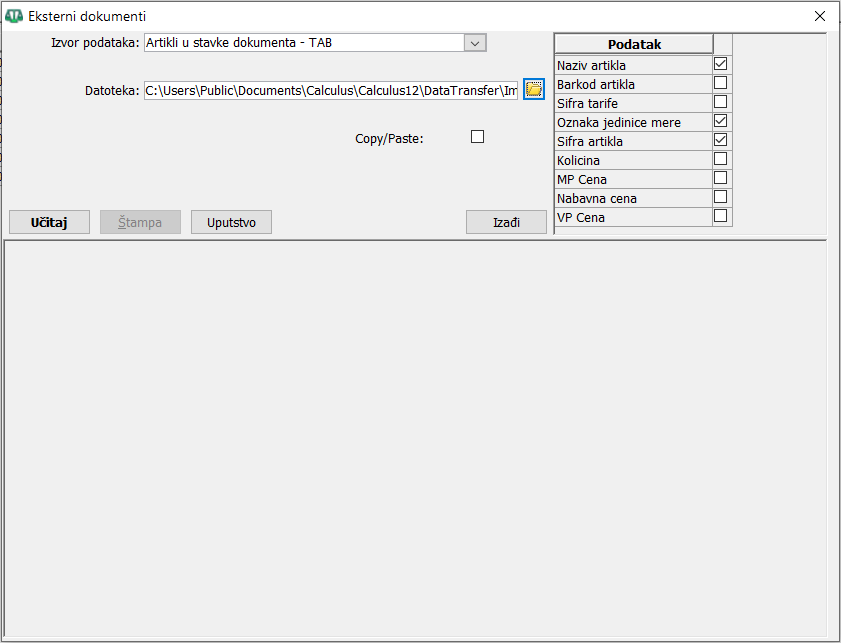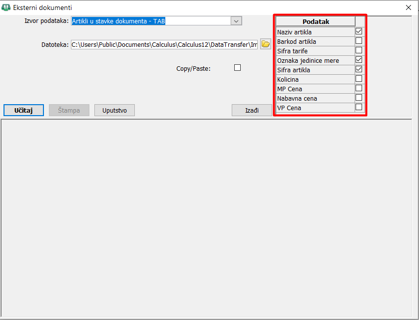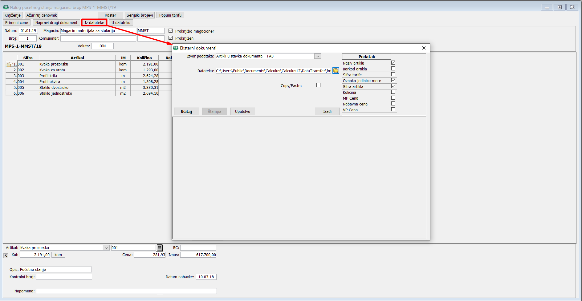 Iz zaglavlja dokumenta u koji želite da uvezete podatke (artikle) ulazite u njegove stavke i klikom na dugme "Iz datoteke otvorite novi iskačući dijalog prozor "Eksterni dokumenti". Prozor sadrži tri sekcije - sekciju za izbor formata datoteke i izbor putanje na kojoj se nalazi datoteka za uvoz, sekciju sa kolonom "Podatak" gde su prikazana polja koja treba da sadrži datoteka iz koje se uvoze podaci i sekciju za prikaz uveženih podataka, ( vidi sliku ) .