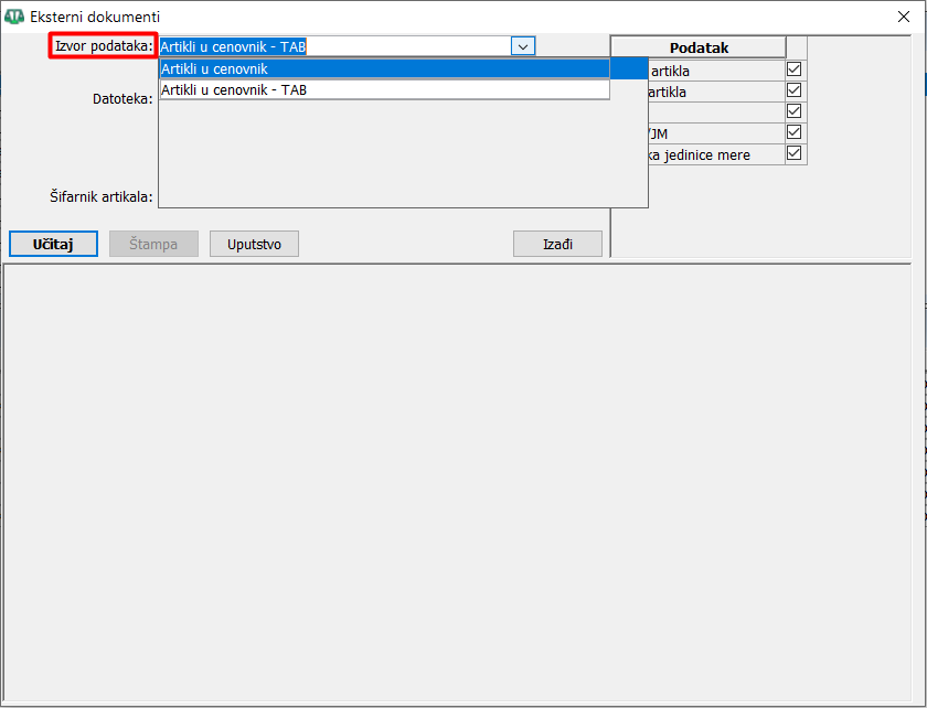 U prozoru "Eksterni dokumenti" potrebno je da podesite nekoliko opcija. Sekcija "Podatak" služi da ukoliko artikli koje učitavate u cenovnik ne postoje u bazi podataka, ukažu programu da najpre ubaci nepostojeći artikal, i odmah zatim ga učita u cenovnik, ( vidi sliku ) .
