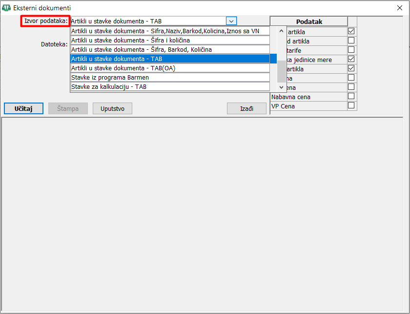 Dijalog prozor "Eksterni dokumenti" koristi se za učitavanje raznih podataka, npr. cenovnika, artikala, naloga za knjiženje, iz datoteka nastalih u drugim programima i izvorima podataka. Datoteka koja se učitava (uvozi, importuje) mora biti u određenom formatu koji se određuje izborom "Izvora podataka", ( vidi sliku ) .
