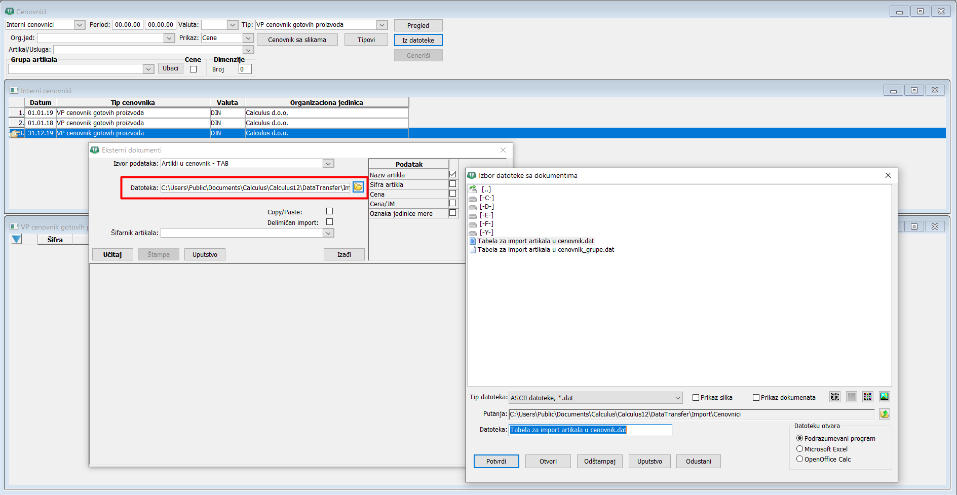 Uvoz podataka se pokreće dugmetom "Učitaj", a posle zatvaranja ovog dijaloga se otvara novi dijalog za obračun kalkulacije, gde je potrebno podesiti opcije koje vam odgovaraju i konačno obračunati kalkulaciju.