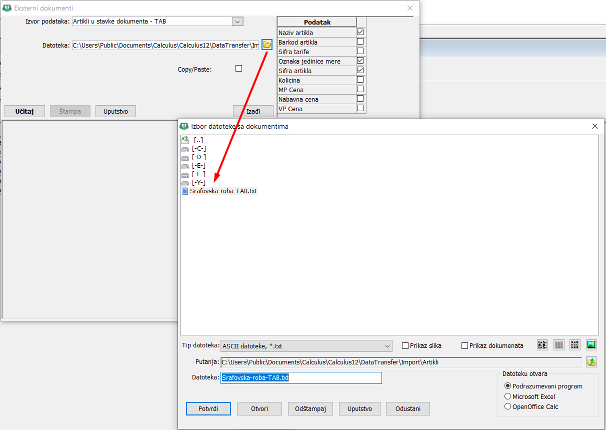 Postupak uvoza podataka "Artikli u stavke dokumenta – TAB"