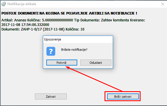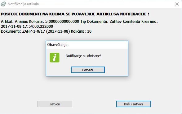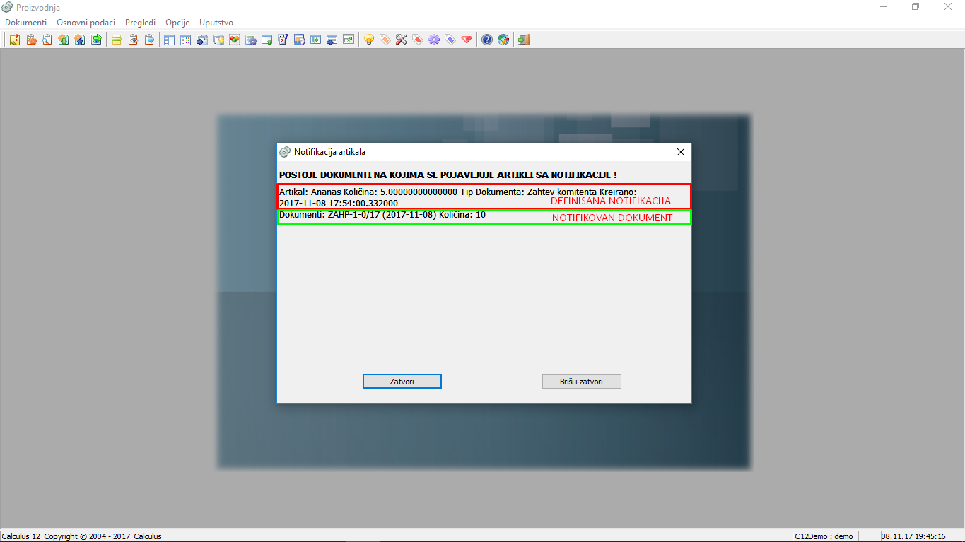 Kada ulogovani korisnik (bilo koji, u ovom slučaju "demo") unese stavku tipa dokumenta sa notifikacije (u ovom primeru je Zahtev komitenta) sa artiklom iz notifikacije (Ananas), Calculus 12 će korisniku "demo" pri pokretanju otvoriti prozor "Notifikacija artikla", ( vidi sliku )