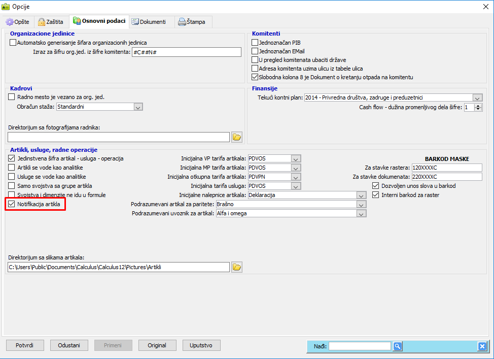 "Notifikacija artikla" inicijalizuje se u opcijama programa gde u listiću "Osnovni podaci" treba potvrditi polje "Notifikacija artikla" ( vidi sliku )