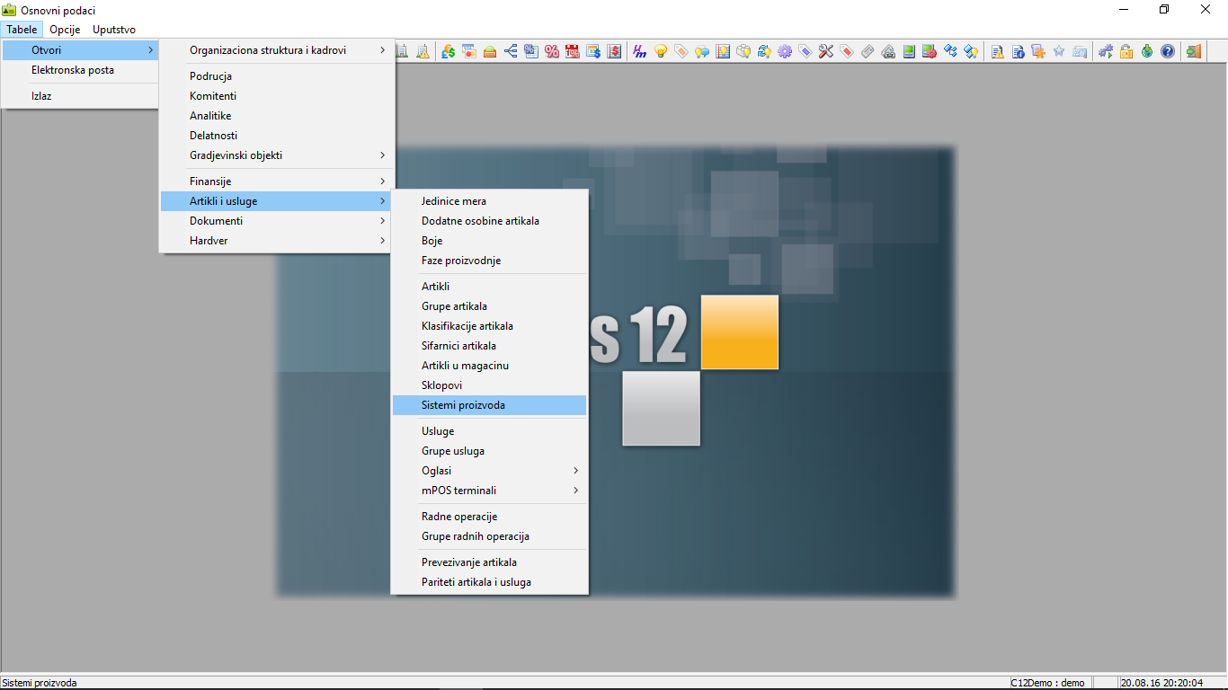 U glavnom meniju programa "Osnovni podaci" odaberite stavku "Tabele - Otvori - Artikli i usluge - Sistemi proizvoda"