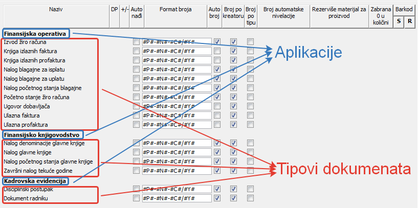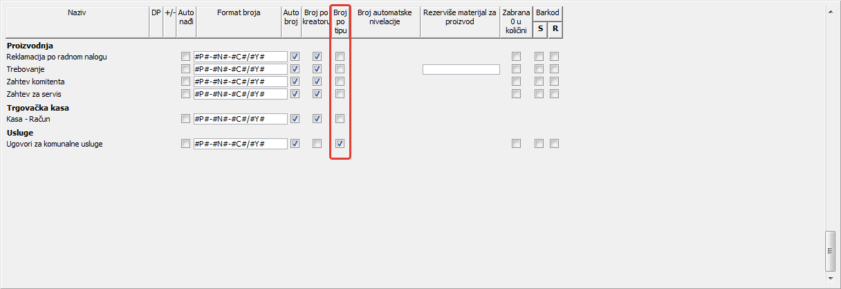 .Ček polje u koloni "Broj po tipu" služi, ukoliko je potvrđeno (čekirano) za određivanje da li će broj dokumenta sadržati samo šifru tipa kreiranog dokumenta ( vidi sliku )
