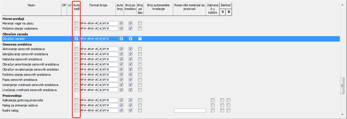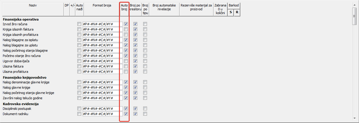 Ček polje u koloni "Auto broj" ukoliko je potvrđeno (čekirano) omogućiće automatsko dodeljivanje rednih brojeve dokumentima koje kreirate ( vidi sliku )