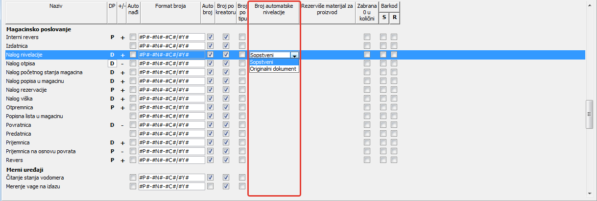 .Kolona "Broj automatske nivelacije" služi da odredi da li će broj automatske nivelacije formirati program ili će biti preuzet broj originalnog dokumenta od kojeg je nastala automatska nivelacija ( vidi sliku )