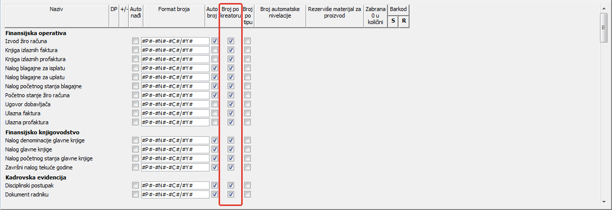 ;Ček polje u koloni "Broj po kreatoru" služi, ukoliko je potvrđeno (čekirano) za određivanje da li će broj dokumenta sadržati i šifru organizacione jedinice koja ga je kreirala ( vidi sliku )