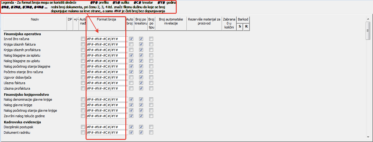 ;Kolona "Format broja" služi za definisanje formata brojeva dokumenata. Za format broja mogu se koristiti sledeće varijable ( vidi sliku )