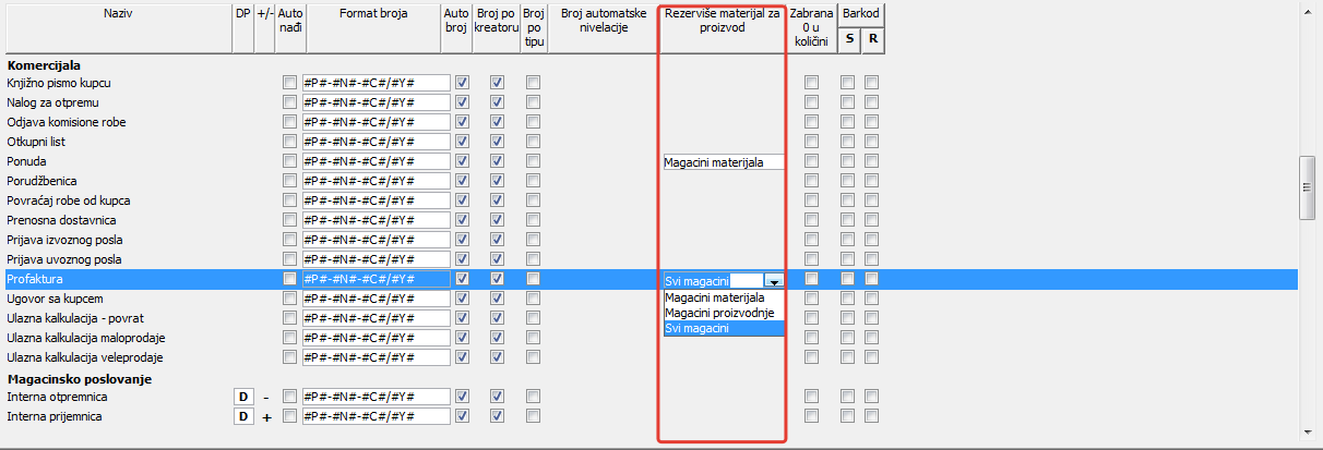 .Kolona "Rezerviše materijal za proizvod" određuje dali će se po magacinima i kojim, rezervisati materijal za izradu proizvoda navedenih u prodajnim ili proizvodnim dokumentima ( vidi sliku )