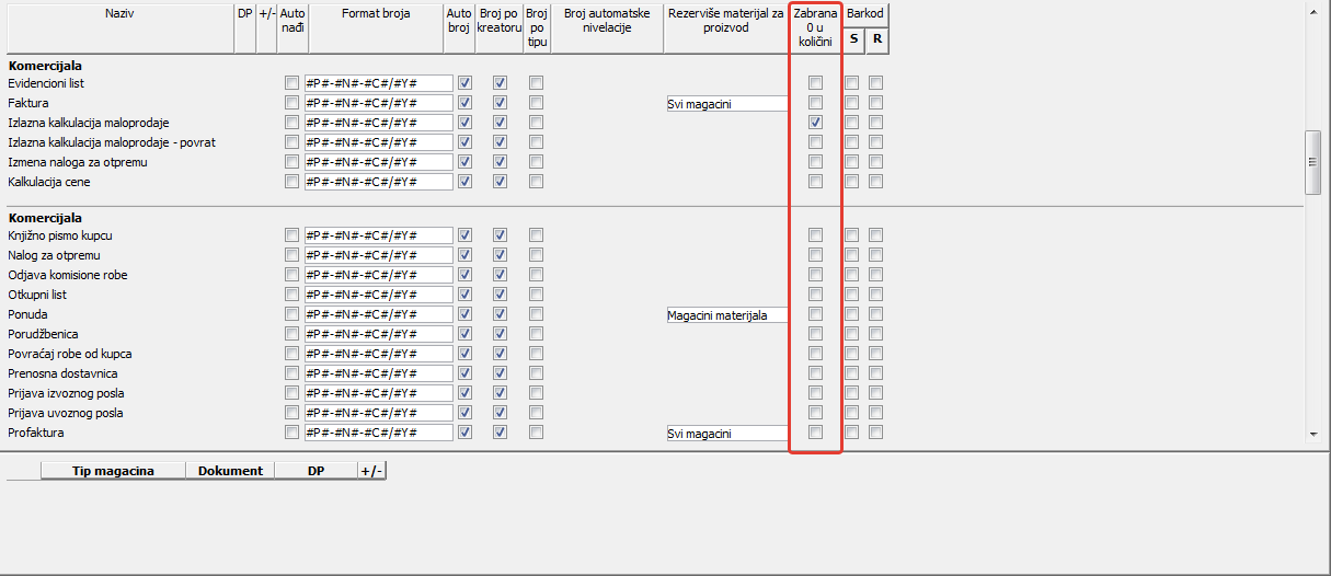 .Ček polje u koloni "Zabrana 0 u količini" služi, ukoliko je potvrđeno (čekirano) da onemogući da stavka dokumenta bude snimljena ukoliko je količina jednaka nuli ( vidi sliku )