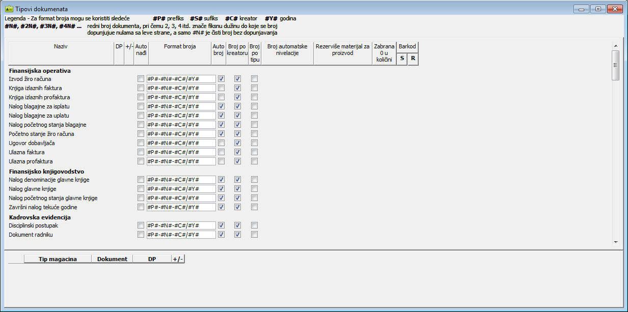 U donjem delu prozora "Tipovi dokumenata" za određenu vrstu magacinskih dokumenta pojedinačno se unosi po tipovima magacina