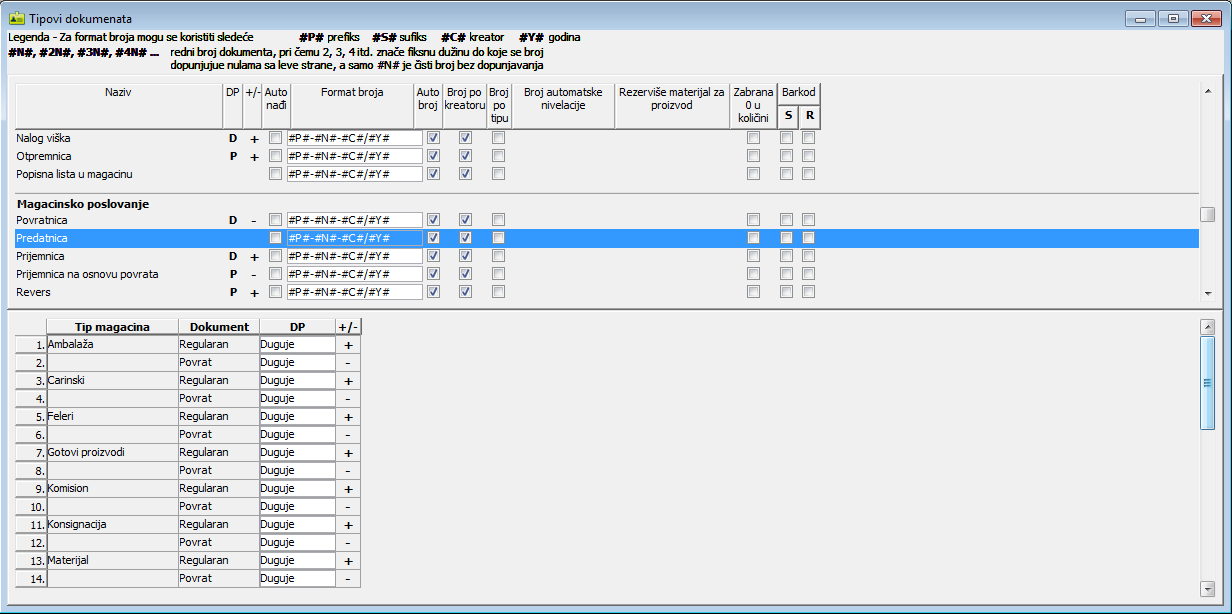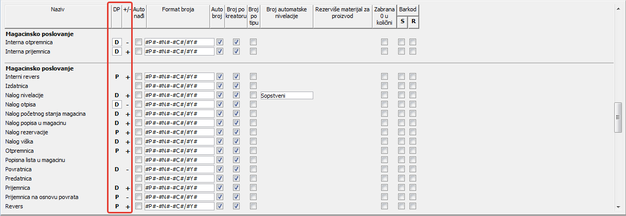 ;Kolone "DP +-" za određene tipove dokumenata definišu dugovnu ili potražnu stranu robne kartice na kojoj će se vršiti ažuriranje u smi sl. da li određena količina artikla ulazi u magacin ili izlazi iz magacina i da li iznos ide na + ili - stranu ( u slučaju internih prijemnica i otpremnica kada se artikli fizički ne nalaze u datom magacinu ali su i dalje u nekom od magacina preduzeća ) ( vidi sliku )
