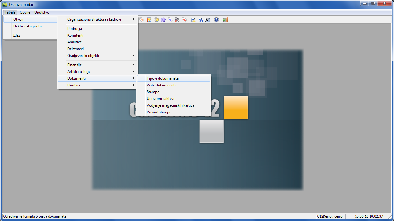U glavnom meniju programa "Osnovni podaci" odaberite stavku "Tabele - Otvori - Dokumenti - Tipovi dokumenata"