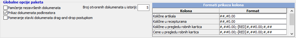 Za ponuđene numeričke kolone (polja) u bazi moguće je odrediti format prikaza. Najčešće se određuje format prikaza količina artikala u dokumentima i količine u recepturama. Inicijalni format gotovo svih numeričkih polja je sa dve decimale, što se definiše sa: #,##0.00. Ako radite samo sa komadnom robom smetaće vam decimale, pa je zgodno podesiti format na #,##0, što znači bez decimala. Ako imate mešovite artikle, možete koristiti i format #, koji znači da će se količine prikazivati na onoliko decimala koliko je potrebno, ali ovo ne izgleda lepo kada je u pitanju tabelarni prikaz, jer kolona sa količinama neće biti poravnata.