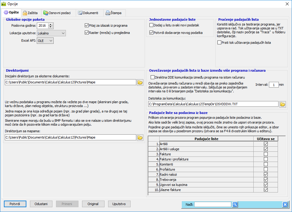 Listić "Dokumenti" - Podešavanje opcija za rad programa sa padajućimm listama i podacima (vidi sliku)