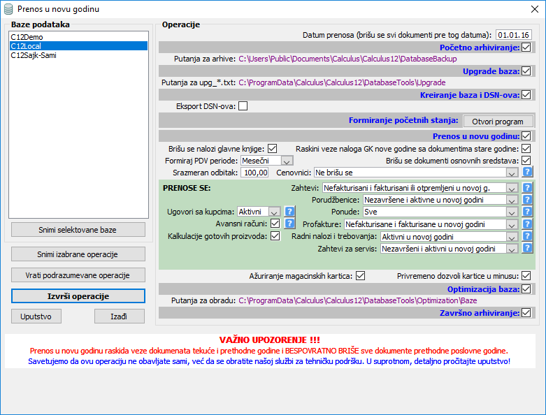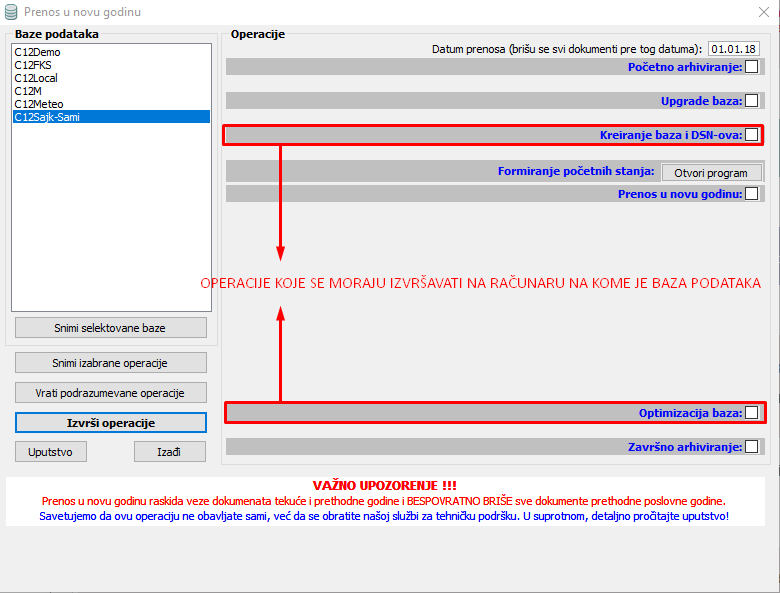Određene operacije prenosa u novu godinu moraju se izvršavati na računaru na kojem se nalaze izabrane baze, bez obzira na to što su one, preko DSN-ova (Data Source Name) dostupne i sa drugih računara.