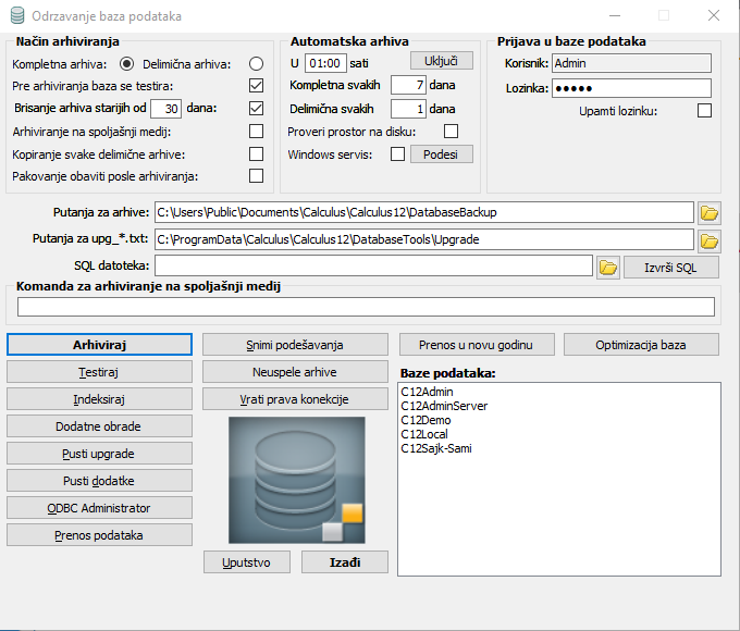 Kod pojedinih operacija prikazane su putanje koje su podešene u ostalim prozorima programa za održavanje baza (putanja za arhiviranje, upgrade, optimizaciju i eksport DSN-ova). Ako neka od ovih putanja ne postoji (nije podešena) odgovarajuća operacija ne može se izvršiti.