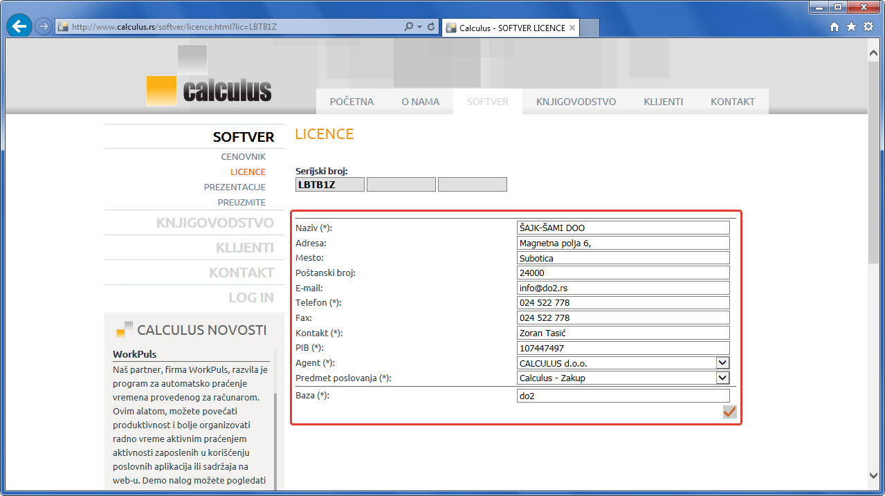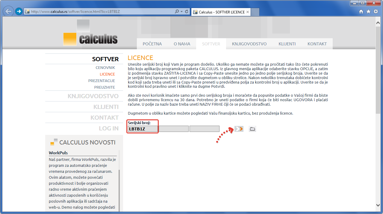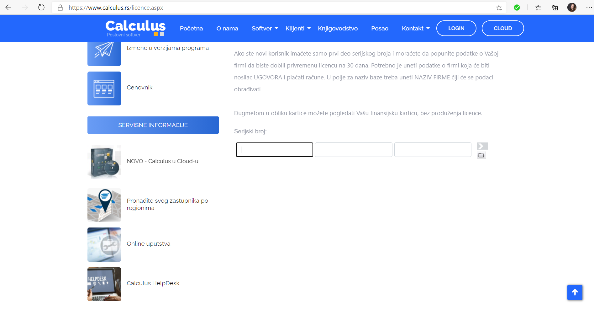 Registracija Vaše kopije Calculus12 softvera i baze podataka nije moguća bez kreiranog serijskog broja.