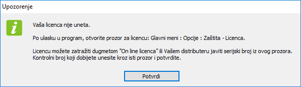 Obaveštenje da licenca nije uneta. znači da je uključena zaštita i da u program više ne možete uneti nijedan novi dokument ili stavku. Ovo je jedino ograničenje. Možete menjati postojeće dokumente, ulaziti u sve prozore i pregledati podatke, ali novi unos više nije moguć.