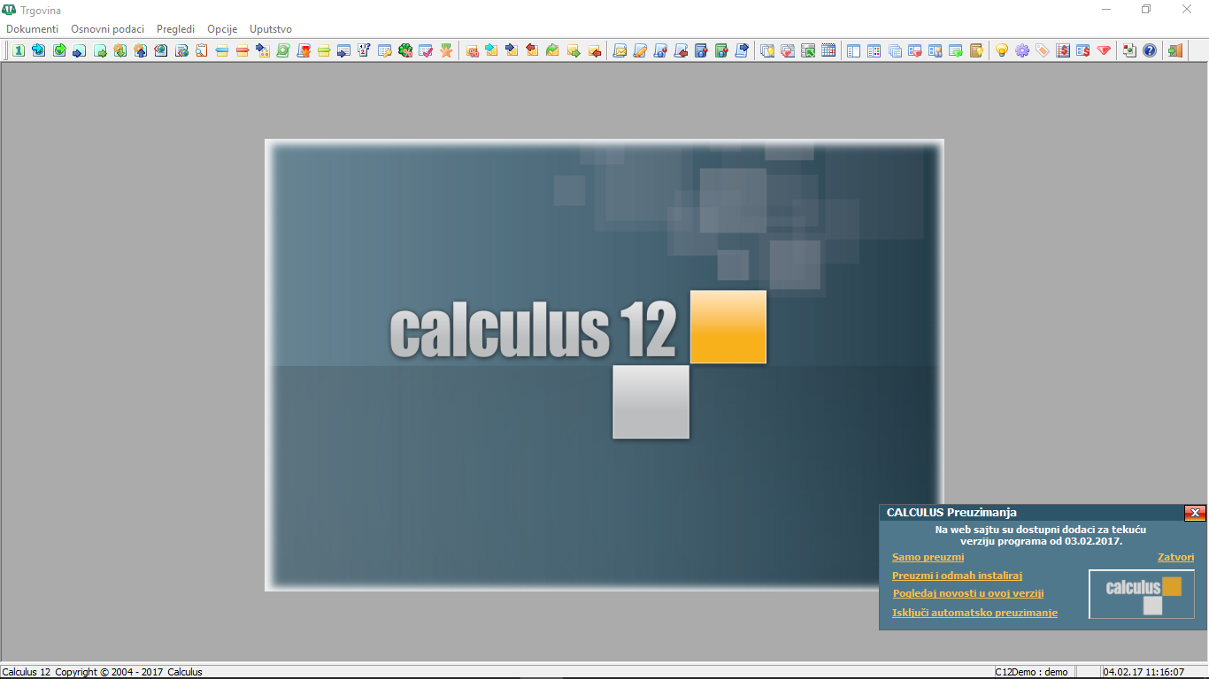 Ako prvi put instalirate Calculus12 i ako ste prihvatili ponudu instalacije za proveru i instalaciju nadogradnji, to je sve. Vi ste spremni da koristite novi Calculus12 softver. Program će samostalno predefinisano na svakih 7 dana proveravati da li ima novih verzija i dodataka ukoliko ste prijavljeni na internet i o tome vas obaveštavati.