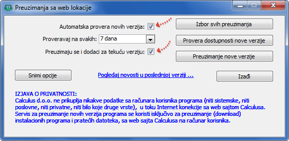 Pokretanjem bilo koje Calculus12 aplikacije postoji mogućnost provere da li na sajtu proizvođača softvera Calculus12 postoji novija verzija. Ova provera je inicijalno isključena, ali se može uključiti po želji. Otvorite bilo koju Calculus12 aplikaciju i iz glavnog menija izaberite Opcije → Preuzimanja.... Čekirajte polja: