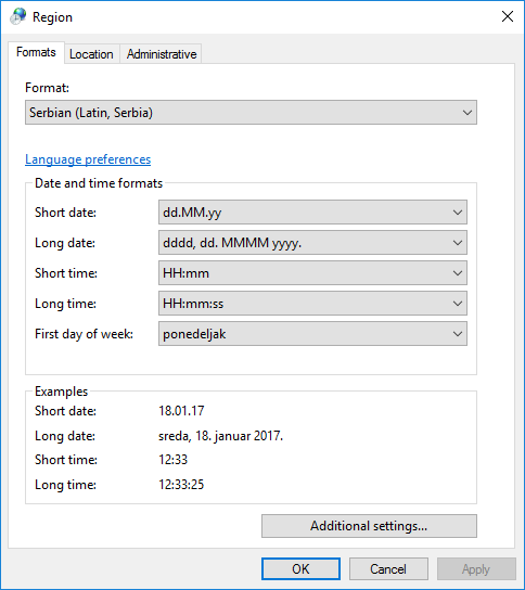 Regionalne opcije podešavaju se u kontrolnoj tabli (Control Panel) Windows-a. Zavisno od verzije i jezika prikaza samog Windows-a, stavke kontrolne table za podešavanje ovih opcija ima donekle različite nazive, npr. "Regionalna podešavanja" (Regional Settings), "Regionalne i jezičke opcije" (Regional and Language Options) ili "Region i jezik" (Region and Language). I sami prozori za podešavanje se donekle razlikuju od verzije do verzije. U ovom uputstvu su dati primeri za Windows XP i Windows 7 interfejs na engleskom ili srpskom jeziku.