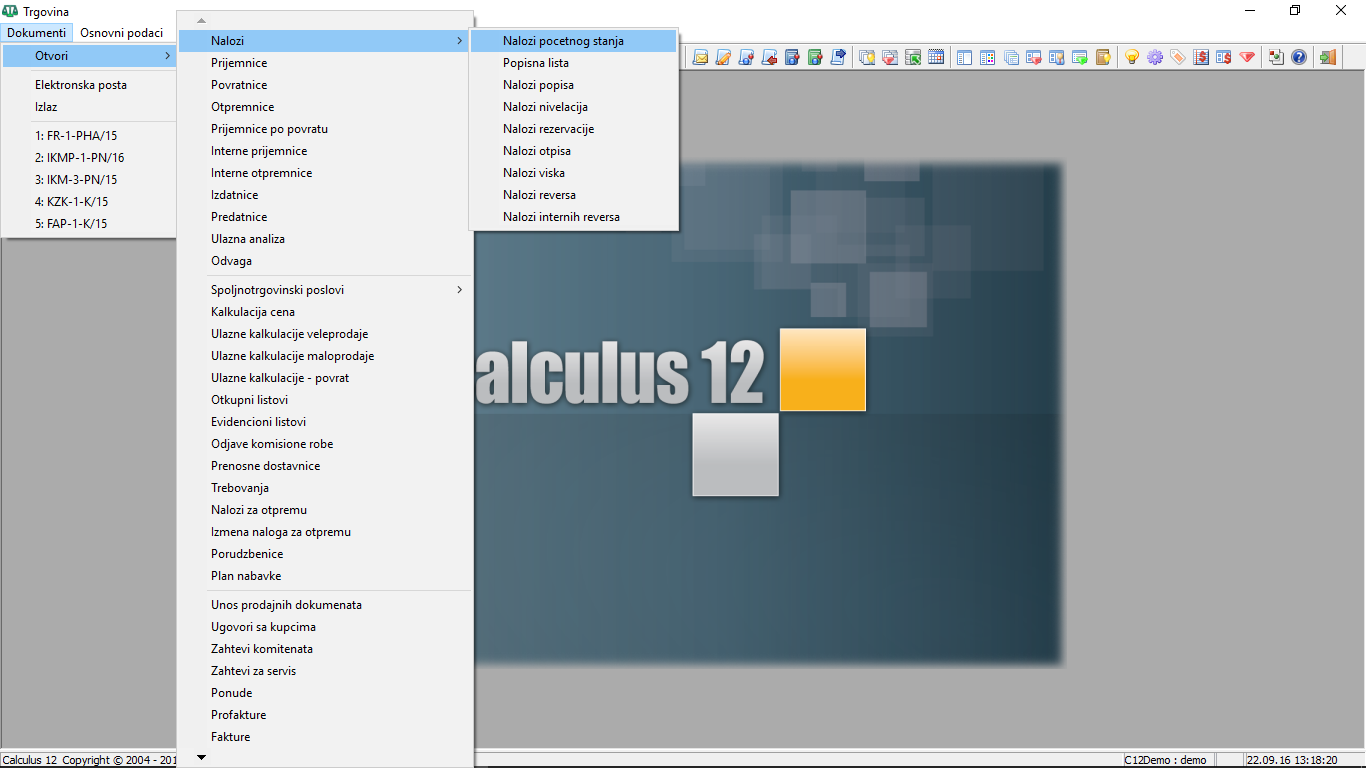 Nalozi početnog stanja su magacinski dokumenti kojima se formiraju početna stanja magacina i koji se mogu kreirati automatski (u slučaju prenosa iz prethodne u novu poslovnu godinu) ili ručno (u slučaju otvaranja novog magacina ili pri kreiranju početnog stanja za prvu godinu u kojoj se koristi Calculus 12). Preporučujemo da prenos u novu poslovnu godinu izvrše serviseri koji su zaduženi za održavanje Calculus-a 12 ili kadrovi zaposleni u vašoj kompaniji koji su obučeni za taj posao.