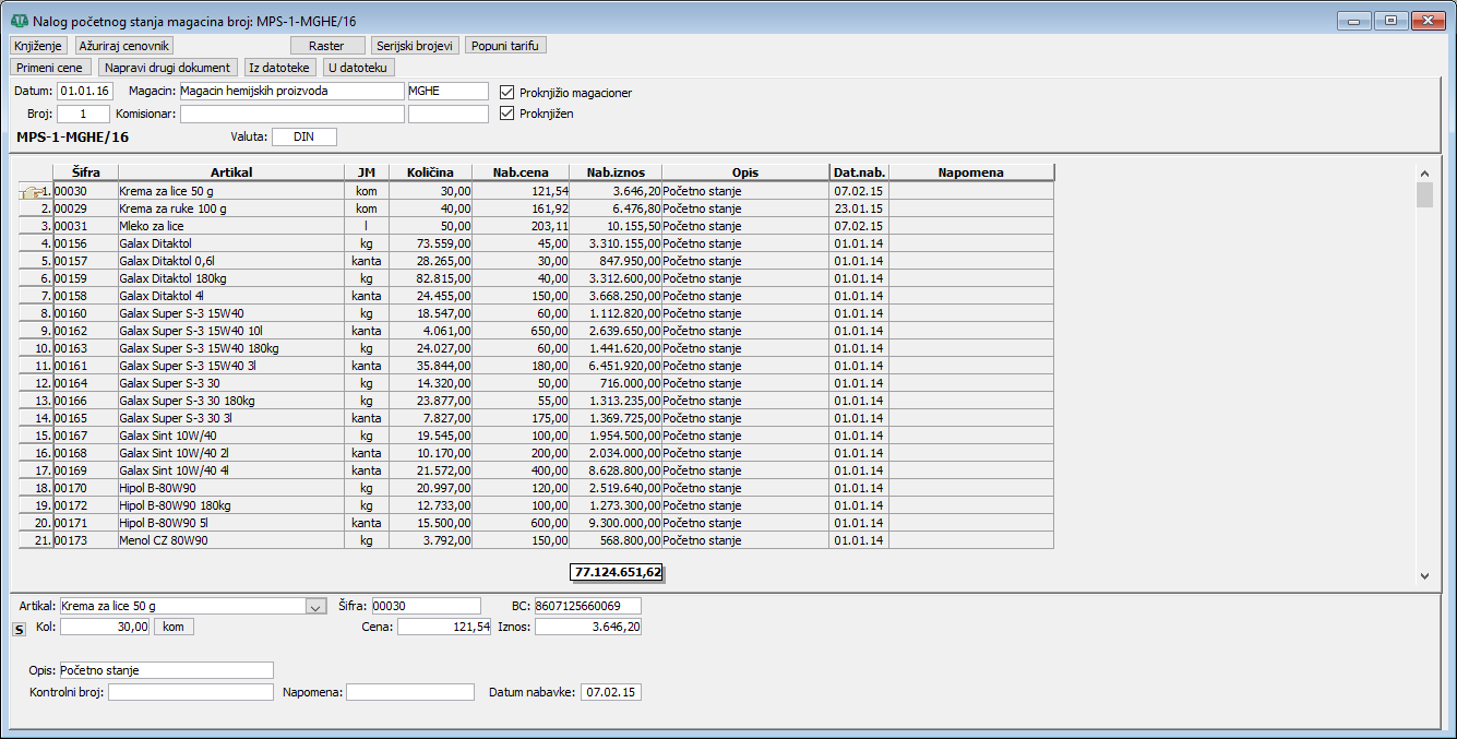 Unesite jediničnu cenu u polje "Cena:" (ili opciono unesite ukupni iznos "Iznos:" iz kojeg će na osnovu unete količine biti izračunata jedinična cena artikla). Nabavna cena artikla (polje "Nab.cena:") će se pojaviti samo kod magacina koji se vode po nabavnoj ceni. Pakovanje artikla (polje "Pak:") biće vidljivo ukoliko je uz artikal definisano i njegovo pakovanje. Tarifa (polje "Tarifa:") i dažbine (polje "Dažbine:") biće vidljivi samo kod magacina koji se vode po velikoprodajnoj i maloprodajnoj ceni. Dodatni opis uz artikal (polje "Opis:") je opciono polje. Kontrolni broj ulaza (polje "Kontrolni broj:") ukoliko se koristi obavezno unesite. Napomena vezana za unos (polje "Napomena:") i datum nabavke artikla (polje "Datum nabavke:") su neobavezna polja. Po završenom unosu svih stavki naloga početnog stanja magacina kliknite na dugme "Snimi" u okviru radnog menija kako biste snimili promene. Ukoliko želite da uneti artikli odmah budu vidljivi na robnim karticama magacina robno ih proknjižite klikom na dugme "Knjiženje"