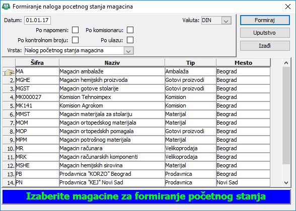 Klikom na dugme Formiraj otvarate prozor za automatsko formiranje početnog stanja magacina. Početno stanje se posle izbora magacina formira klikom na dugme Formiraj iz ovog prozora. To je naravno moguće učiniti i za magacine komisionara tako što čekirate opciju "Po komisionaru". Ako čekirate opciju "Po napomeni" biće preneta napomena ukoliko je navedena uz artikal i ako čekirate opciju "Po kontrolnom broju" biće prenet kontrolni broj ukoliko je naveden uz artikal (vidi sliku) Automatska izrada naloga..