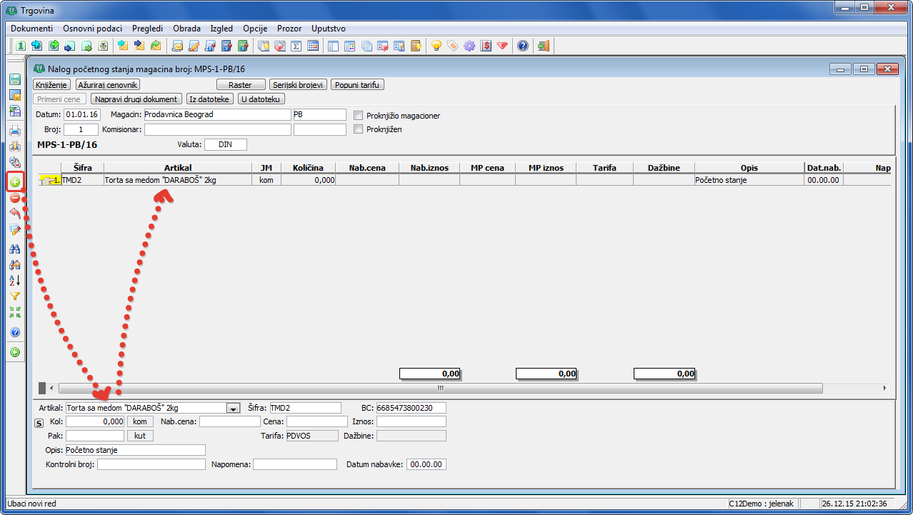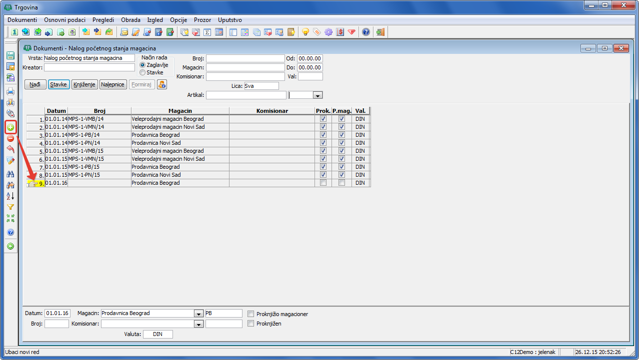 Klikom na dugme "Ubaci novi red" formirate novi nalog početnog stanja magacina (vidi sliku)