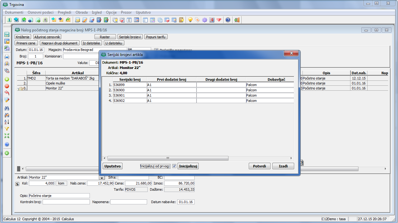 Ukoliko artikal vodite po serijskim brojevima klikom na dugme "Serijski brojevi" unosite serijske brojeve artikla sa dodatnim kolonama za dobavljača i dokument nabavke (vidi sliku)