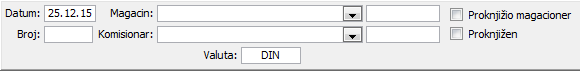 U editor zaglavlja naloga početnog stanja magacina unosi se naziv ili šifra magacina definisanog pri organizacionim jedinicama preduzeća za koji se formira početno stanje i/ili komisionar (ukoliko preduzeće prodaje komisionu robu) i na kraju valuta ukoliko se razlikuje od osnovne valute (DIN, EUR...) (vidi sliku) Editor zaglavlja..