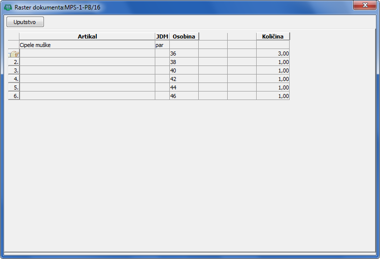Klikom na dugme "Raster" dobiće se prikaz dodatnih osobina artikla (vidi sliku)