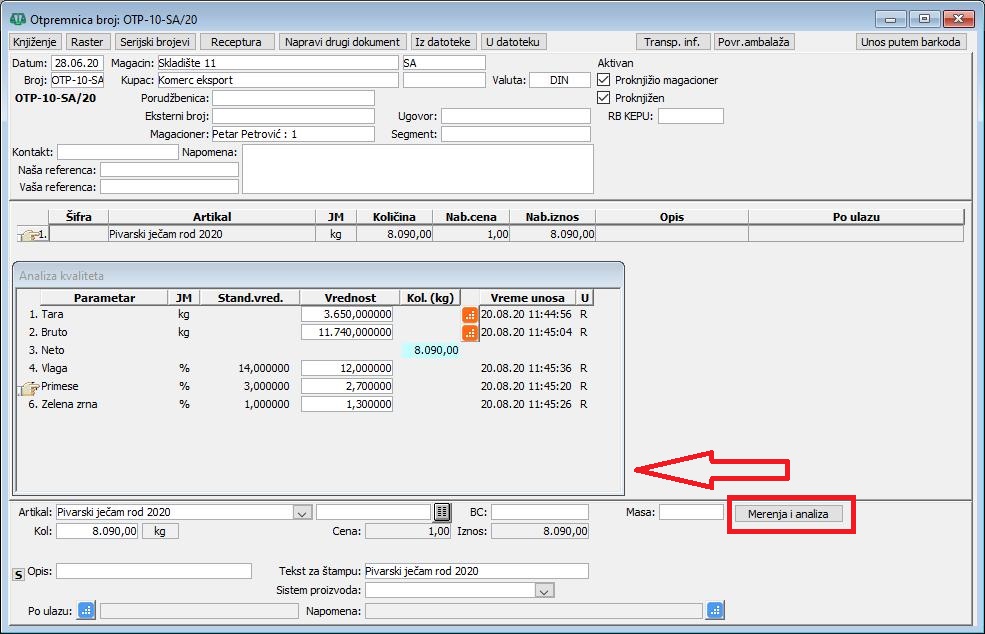 U otpremnicama je moguće unos izmerenih masa preko vage i parametara izlazne analize, kod izlaza otkupljenih poljoprivrednih proizvoda. Ne postoji poseban prozor kao kod ulazne analize (gde se obavlja i mnogo drugih operacija), već se u samom prozoru stavki otpremnice, za tekuću stavku otvara panel za analizu dugmetom "Merenja i analiza", (vidi sliku) .