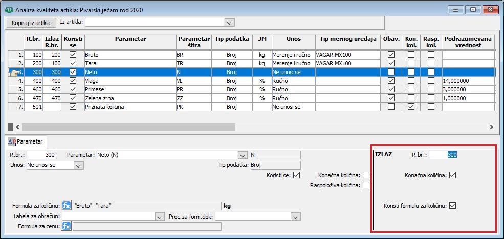 - R.br. – Određuje redosled parametara kod izlazne analize. Tipično je da se kod izlaza bruto i tara prikazuju obrnutim redosledom nego kod ulaza. Ovo polje nije obavezno, pa ako se ne unese, taj parametar se neće koristiti kod izlazne analize (npr. kod izlaza se tipično ne koristi priznata količina).