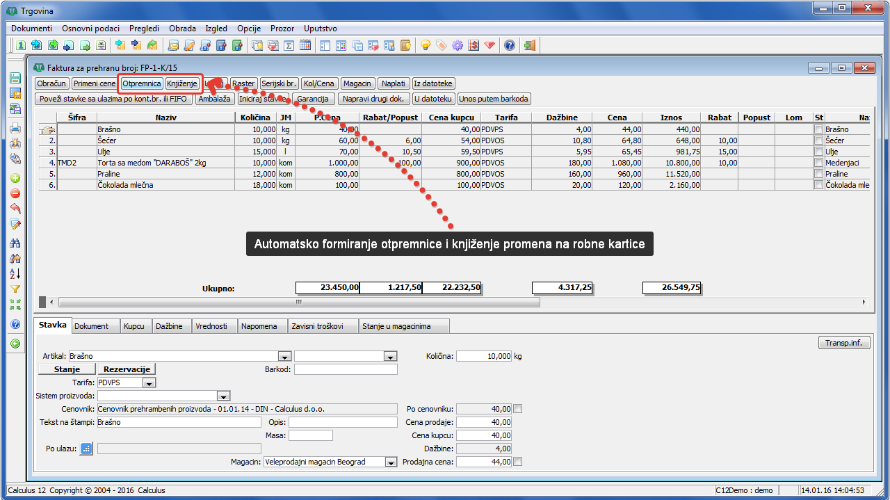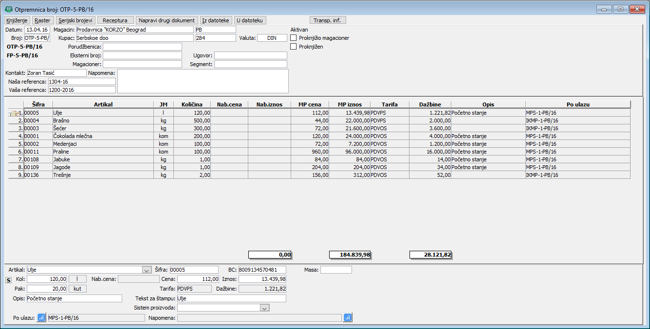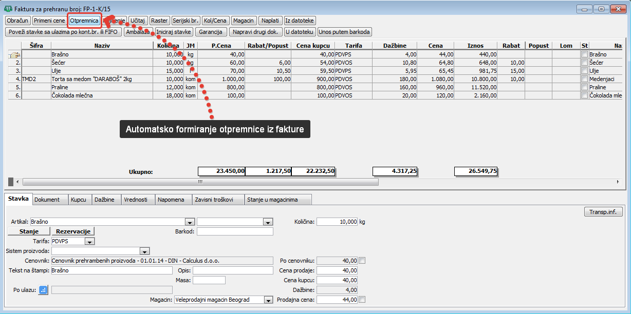 Klikom na dugme "Otpremnica" u stavkama fakture formirate izlaz robe iz magacina. Klikom na dugme "Knjiženje"