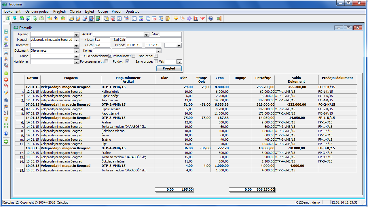 Sve otpremnice, zajedno sa artiklima koji se na njima nalaze, prikazuju se u "Dnevniku". Za detaljan uvid u izdatu robu po otpremnicama, periodima i magacinima iz glavnog menija izaberite stavku "Pregledi > Dnevnik" (vidi sliku) Dnevnik - prikaz otpremnica..