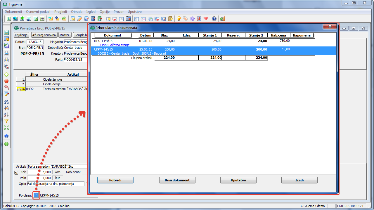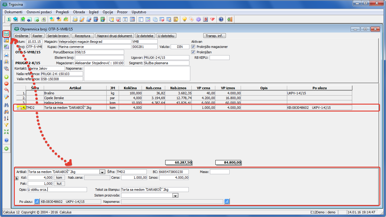 Popunite polje "Artikal:" (opciono šifru ili barkod artikla) a zatim u polje količina "Kol:" unesite količinu u skaldu sa jedinicom mere ili količinu pakovanja ukoliko je definiisano uz artikal. Polja "Cena:" i "Iznos:" unose se automatski iz kartice artikla ali se mogu uneti i ručno. U polje "Opis:" se navode opcione karakteristike artikla ukoliko su bitne za kupca a u polje "Tekst za štampu:" se unosi naziv artikla koji će biti štampan na svim štampanim dokumentima. Polje "Sistem proizvoda:" se popunjava automatski ukoliko artikal pripada već definisanom sistemu proizvoda (npr. ventilacioni ili dimnjački sistemi), polje "Napomena:" je opciono i može sadržati proizvoljan tekst vezan za konkretan artikal. Polje "Masa:" je opciono polje a u polje "Po ulazu:" klikom na dugme unosi se iz prozora "Izbor ulaznih dokumenata" kontrolni broj ulaza (vidi sliku)