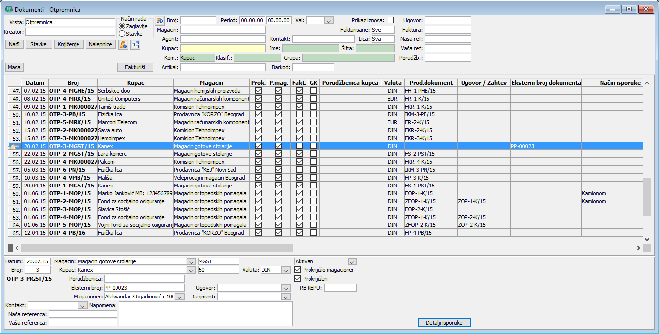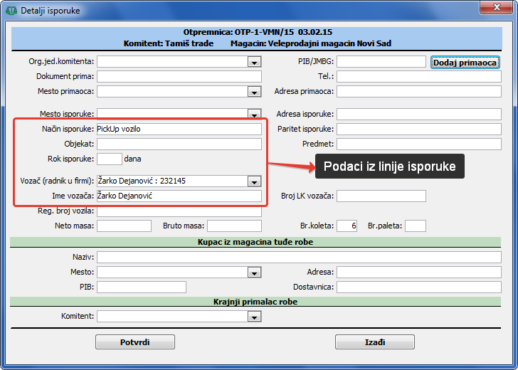 U zaglavlje otpremnice se unose: datum - programski se upisuje sistemski datum ali se može menjati, magacin iz koga će se evidentirati izlaz robe, naziv kupca, status otpremnice (aktivan ili neaktivan), valuta, broj porudžbenice kupca za koju se vezuje izlaz po otpremnici, broj eksternog dokumenta za koji se vezuje data otpremnica, broj ugovora sa kupcem ukoliko postoji, redni broj u KEP knjizi, magacioner zadužen za magacin iz kojeg se izdaje roba, nadređeni segmet iz spiska organizacionih jedinica, službenik kupca za kontakt odnosno ime osobe zaposlene u preduzeću kupca koja će primiti otpremnicu, reference dobavljača i kupca ukoliko su navedene u pratećoj dokumentaciji i napomena vezana za isporuku. Klikom na dugme "Detalji isporuke" otvara se prozor za unos svih transportnih podataka koji su vezani za otpremu robe (vidi sliku)