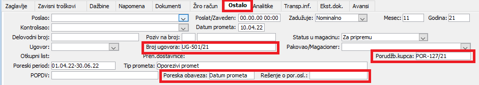 Listić Ostalo ( vidi sliku ) - sadrži sledeće podatke: Za potrebe sistema eFaktura Ministarstva finansija, koriste se tri polja za datum poreske obaveze, rešenje o poreskom oslobođenju i broj ugovora..