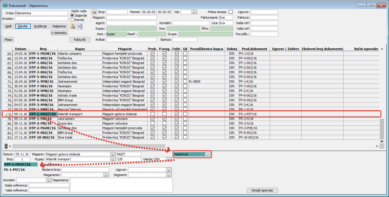 Status aktivnosti otpremnice - "Aktivan" ili "Neaktivan". Formiranoj otpremnici iz određenih razloga možete promeniti status iz aktivnog u neaktivan. Neaktivna otpremnica nema uticaj na stanje artikala na karticama. Stavke u artiklima neaktivne otpremnice mogu se videti na magacinskim karticama promenom statusa sa neaktivnog na aktivni (vidi sliku) .Status otpremnice..