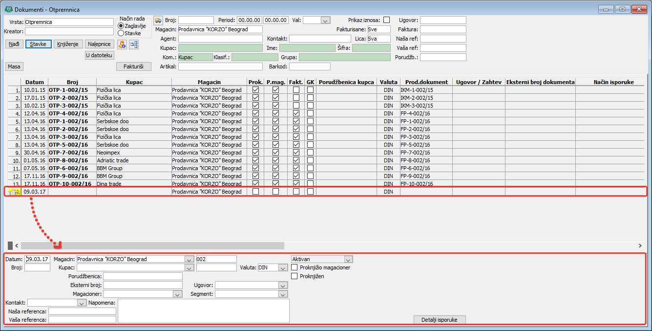Postavite period dokumenata i po potrebi postavite uslov za pretragu. Zatim izaberite vrstu dokumenta iz padajuće liste "Vrsta:". Ukoliko imate samo jednu definisanu vrstu dokumenta, preskočite ovaj korak. Kliknite na dugme "Nađi" kako biste izlistali sva dokumenta za izabrani period ili postavljeni uslov pretrage. Klikom na dugme "Ubaci novi red" formirate novu otpremnicu (vidi sliku)