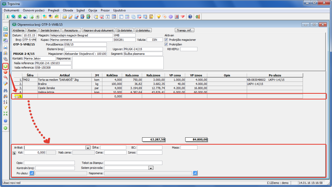 Klikom na dugme "Ubaci novi red" formirate novu stavku otpremnice (vidi sliku)